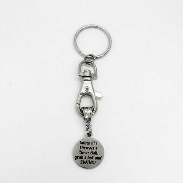 This keychain would make a motivational gift. It has a stainless steel laser engraved charm with “When life throws you a fast ball, grab a bat and SWING” on it.