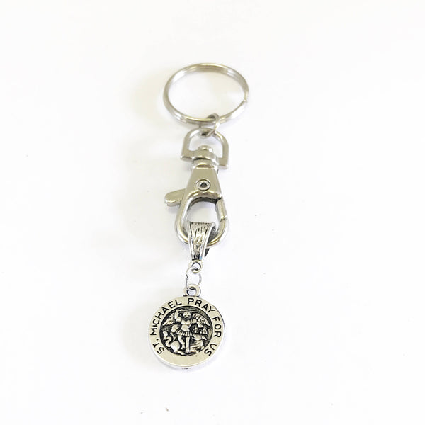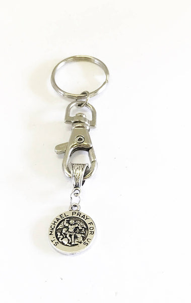 This is a great keychain with a silver tone pendant that says "St. Michael Pray For Us" on it.