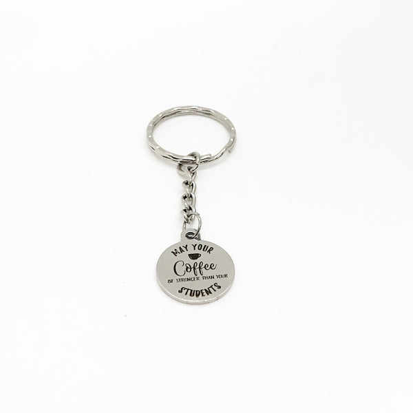 This is a great keychain gift with a stainless steel laser engraved charm with “May your coffee be stronger than your students” on it.