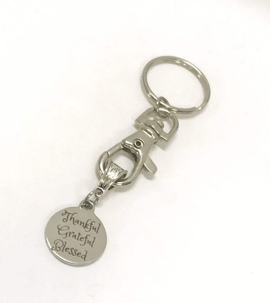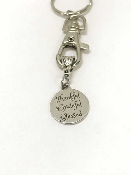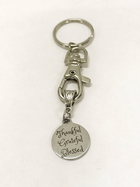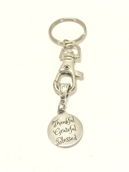 This is a beautiful keychain to serve as an encouragement! It has a stainless steel laser engraved charm with "Thankful Grateful Blessed" on it.