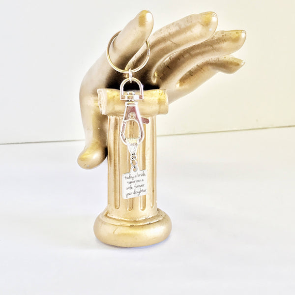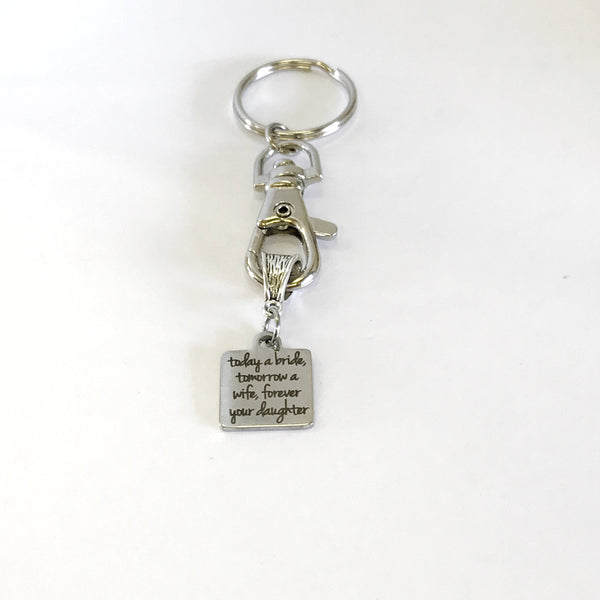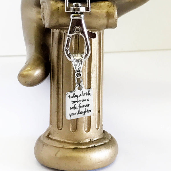 Looking for sentimental gift to give to your parents on your wedding day? This keychain includes a stainless steel laser engraved charm with "Today a bride, tomorrow a wife, forever your daughter" on it. Each keychain comes individually gift boxed.