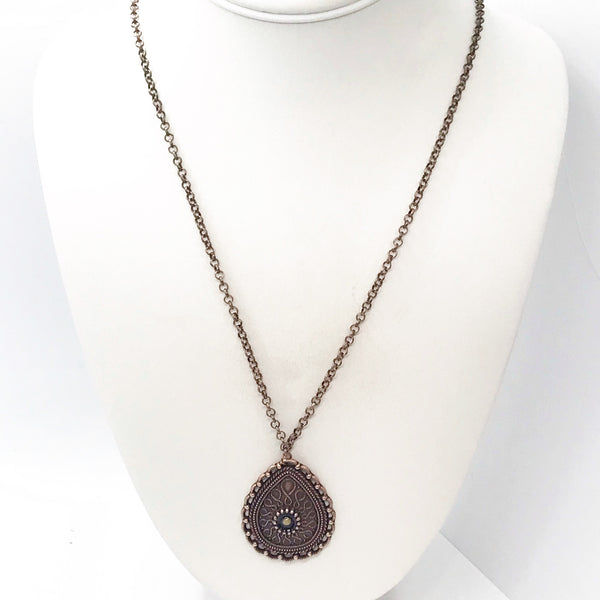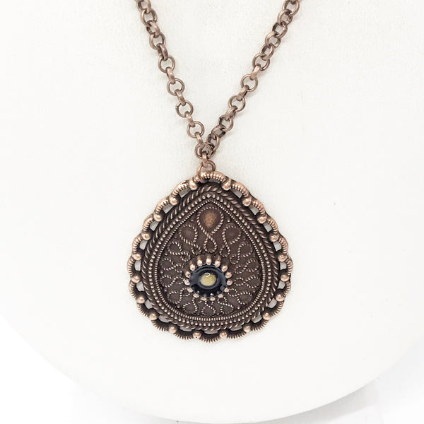 This is a beautiful antique copper finish ornate teardrop mustard seed necklace. This pendant is available on your choice of 16, 18, 20, 22 or 24 inch chain. The pendant is also available for individual purchase if you have another chain on which you would like to wear it. The pendant measures approx. 34mm by 40mm.