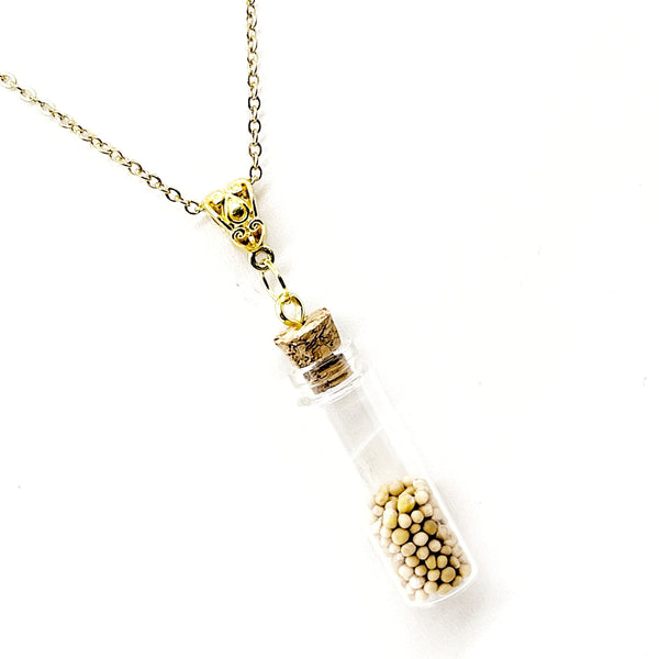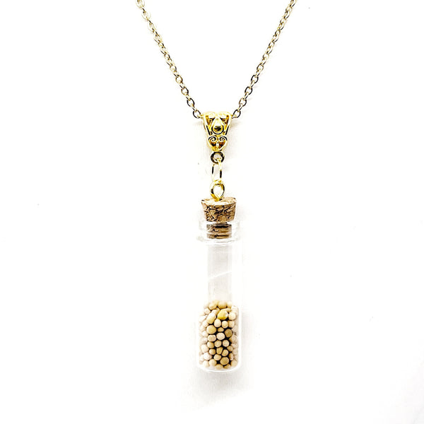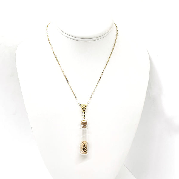 This is a gold-plated mustard seed necklace pendant to represent the Bible verse of Matthew 17:20 and to remind the wearer "if you have faith as small as a mustard seed... nothing will be impossible for you". The pendant includes a mustard seed charm along with a faith charm. This pendant is available on your choice of 16, 18, 20, 22, 24, 26, 28 or 30 inch gold-plated chain. The pendant is also available for individual purchase if you have another chain on which you would like to wear it.