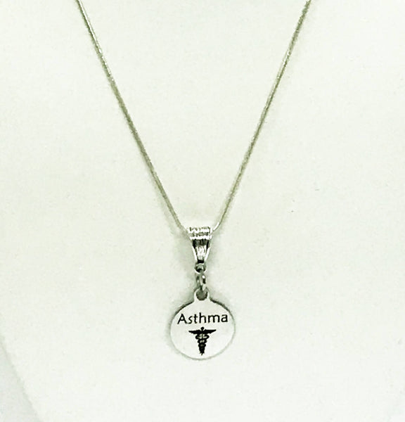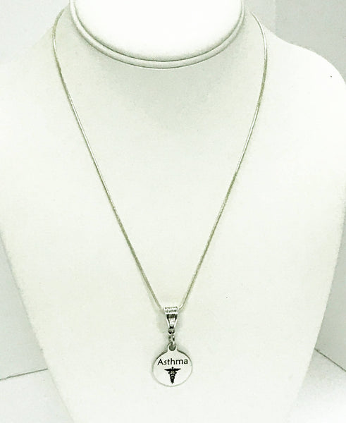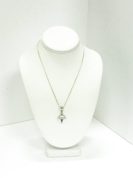 This is a stainlses steel laser engraved pendant on a sterling silver plated chain. The pendant has a Asthma medical condition symbol on it. This pendant is available on your choice of 16, 18, 20, 22, 24, 26, 28 or 30 inch sterling silver plated chain. The pendant is also available for individual purchase if you have another chain on which you would like to wear it.