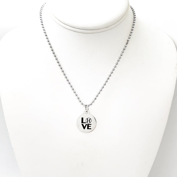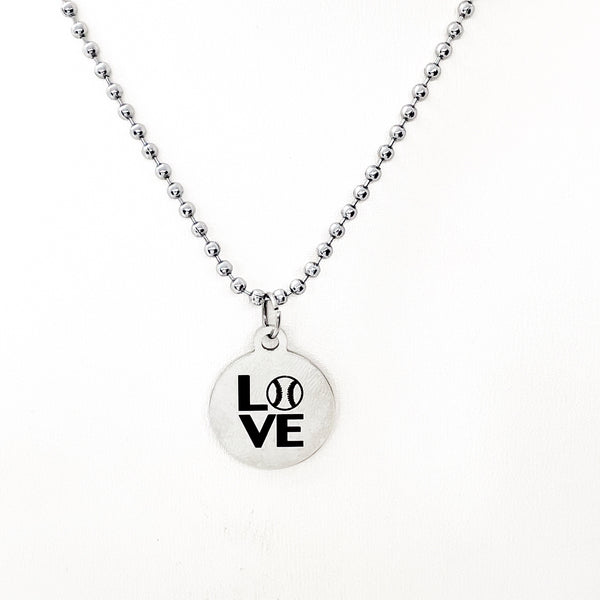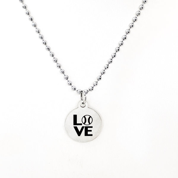 The piece is stainless steel laser engraved charm on a 24 inch ball chain. It has “LOVE” with a baseball where the O is on it