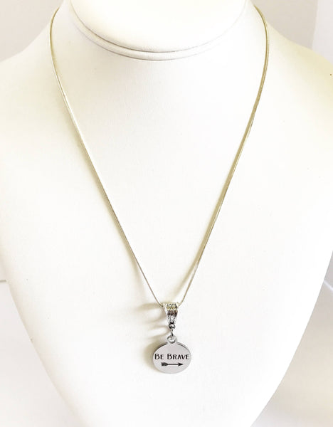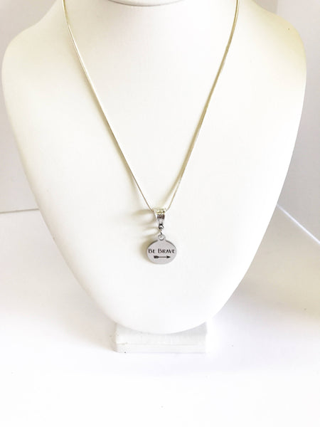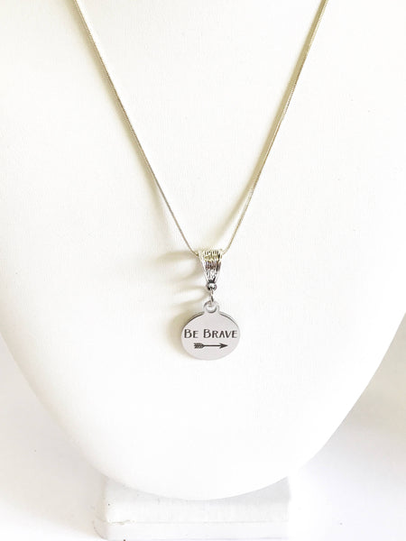 This is a beautiful stainless steel laser engraved pendant on a sterling silver plated chain. The pendant contains the words "Be Brave" with an arrow. This would be a great gift of encouragement for yourself or a gift for someone you love! This pendant is available on your choice of 16, 18, 20, 22, 24, 26, 28 or 30 inch sterling silver chain.