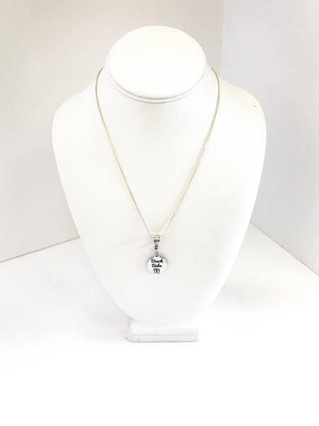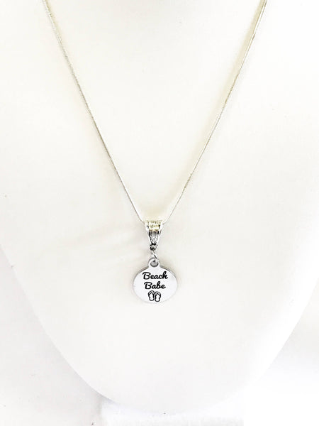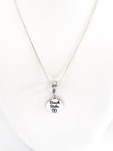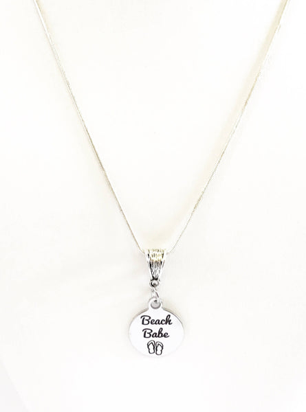 This is a stainlses steel laser engraved pendant on a sterling silver plated chain. The pendant has "Beach Babe" on it. This pendant is available on your choice of 16, 18, 20, 22, 24, 26, 28 or 30 inch sterling silver chain. The pendant is also available for individual purchase if you have another chain on which you would like to wear it.