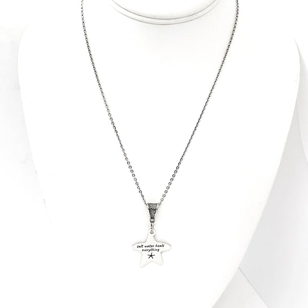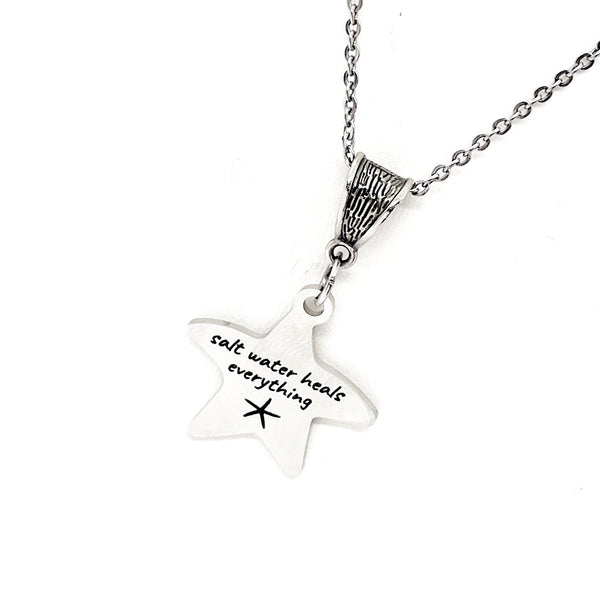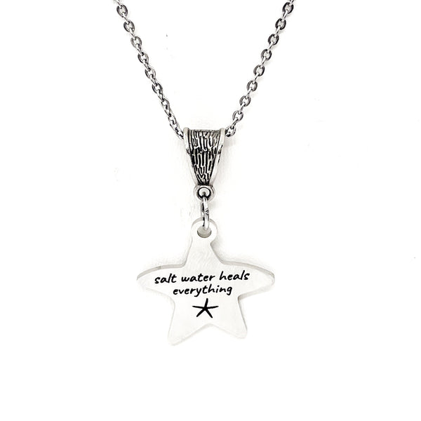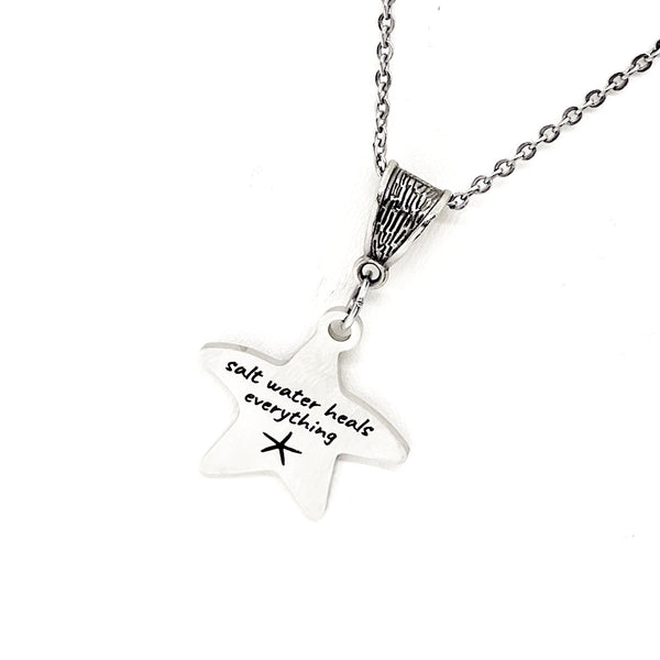 This beautiful necklace would make a great love jewelry piece. The pendant is a stainless steel laser engraved charm with “Salt water heals everything” on it with a silver-tone bail.