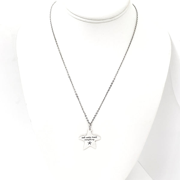This beautiful necklace would make a great love jewelry piece. The pendant is a stainless steel laser engraved charm with “Salt water heals everything” on it.