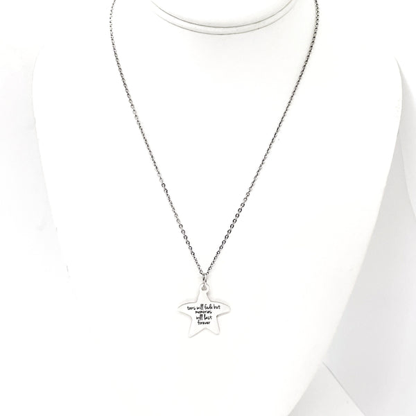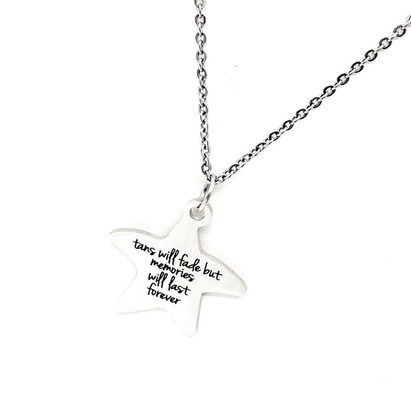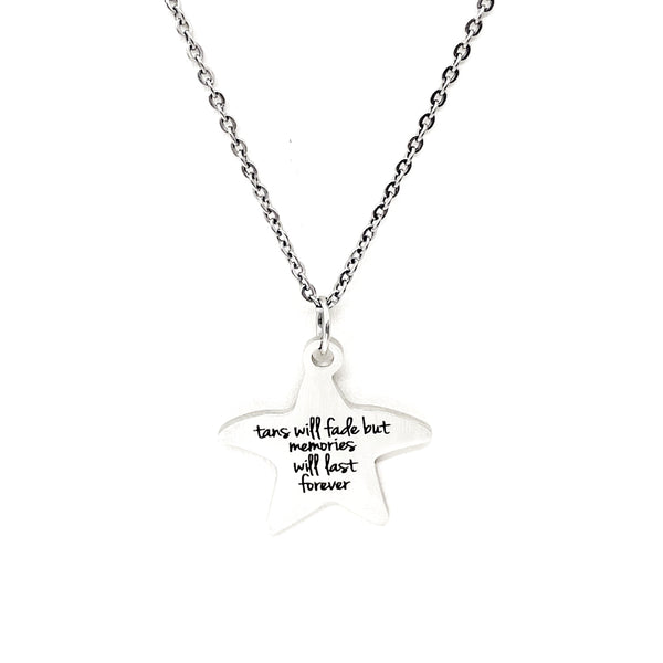 This beautiful necklace would make a great love jewelry piece. The pendant is a stainless steel laser engraved charm with “Tans will fade but memories will last forever” on it.
