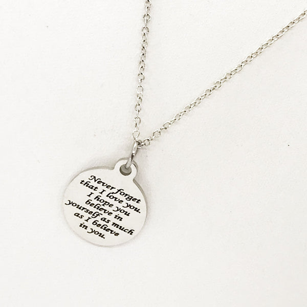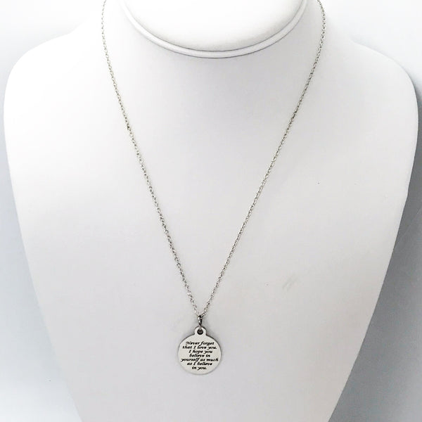 This silver necklace is a simple but beautiful gift for a loved one in your life. It is a stainless steel laser engraved charm on a stainless steel link chain. The charm has the following on it: