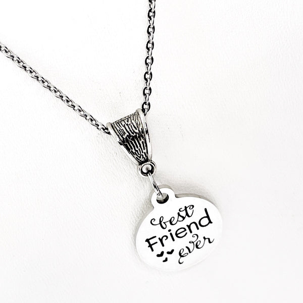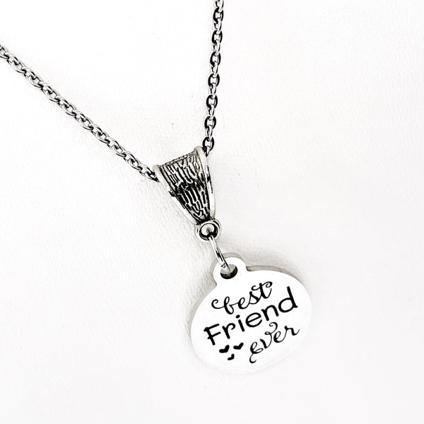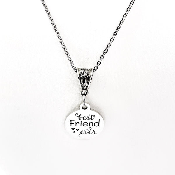 This is a stainless steel laser engraved pendant on a stainless steel link chain. The pendant says “Best friend ever”