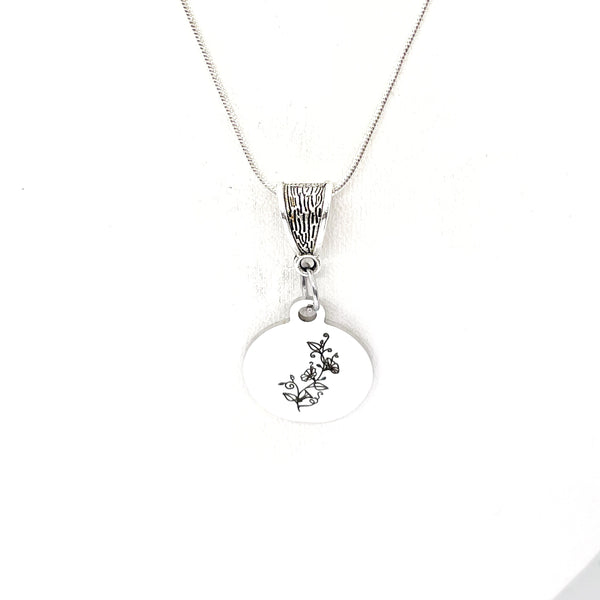 This is a great jewelry gift. It is a stainless steel laser engraved pendant on a silver-plated snake chain. The pendant has a Morning Glory flower, the birth month flower for September, on it.
