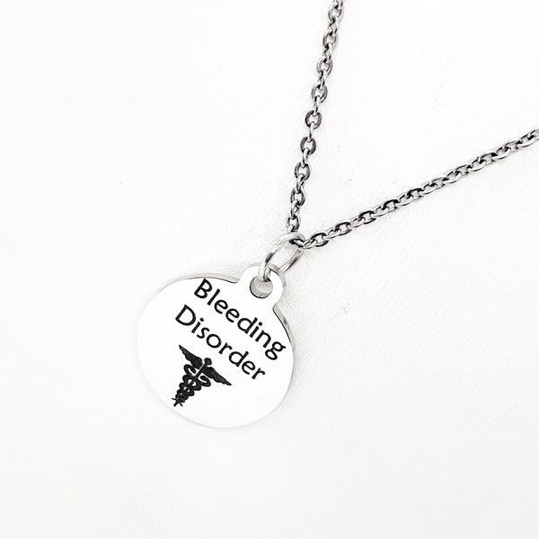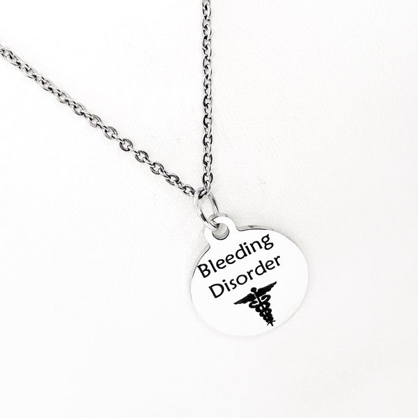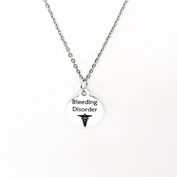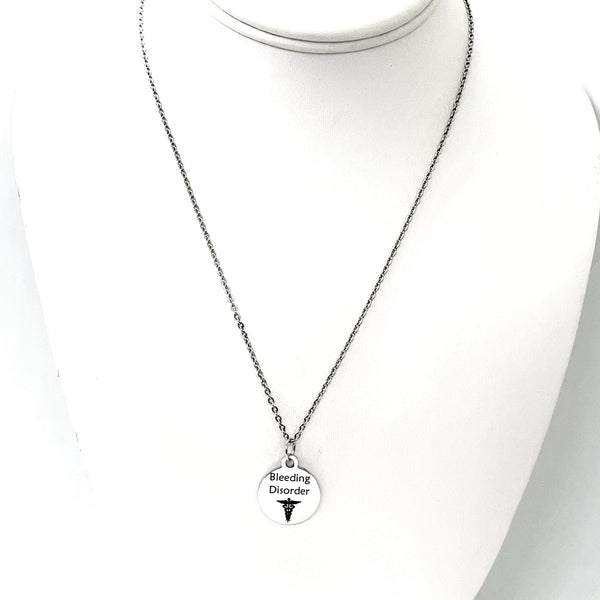 This is a stainless steel laser engraved pendant on a stainless steel chain. The pendant has “Bleeding Disorder” and a medical caduceus symbol on it. This pendant is available on your choice of 16, 18, 20, 22, 24, 26, 28 or 30 inch chain. The pendant is also available for individual purchase if you have another chain on which you would like to wear it. For an additional charge, the charm can be customized to meet your specific needs.