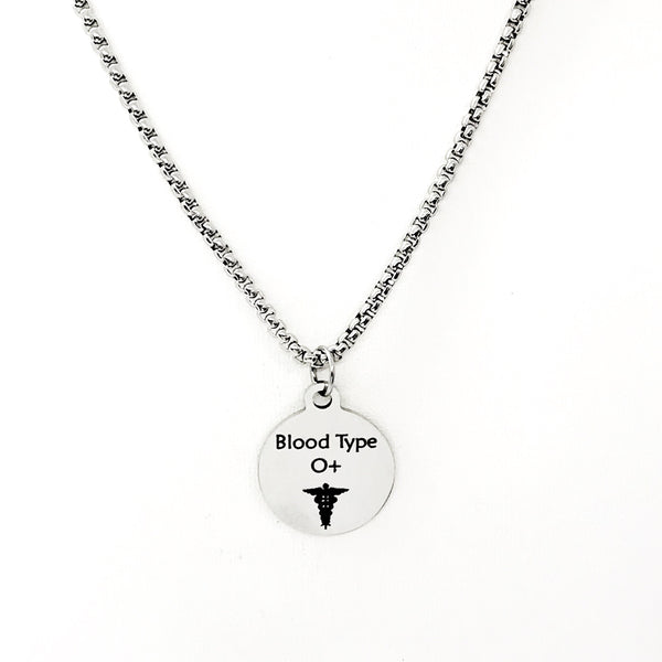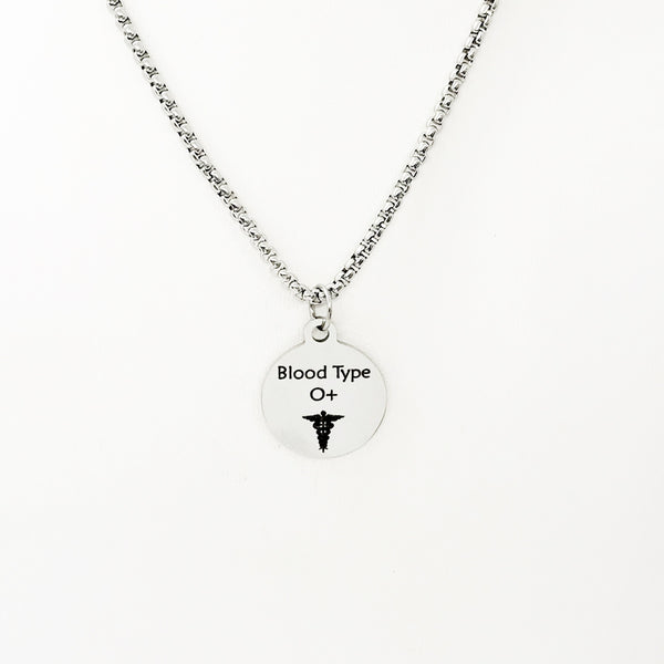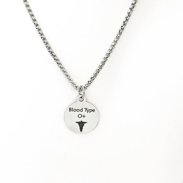 This is 22” stainless steel box chain necklace that would work well for both men and women. It has a stainless steel laser engraved pendant that has your blood type on it. The charm measures approx. 3/4 inch.