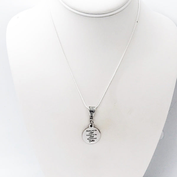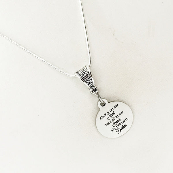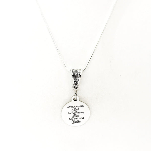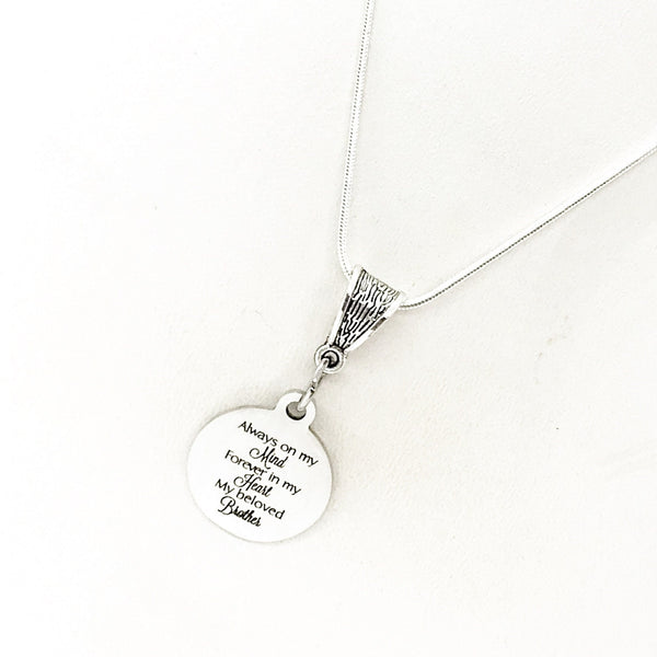 This is a stainless steel laser engraved pendant on a silver-plated snake chain. The pendant has "Always on my mind, Forever in my Heart, My Beloved Brother" on it. This pendant is available on your choice of 16, 18, 20, 22, 24, 26, 28 or 30 inch chain. The pendant is also available for individual purchase if you have another chain on which you would like to wear it.