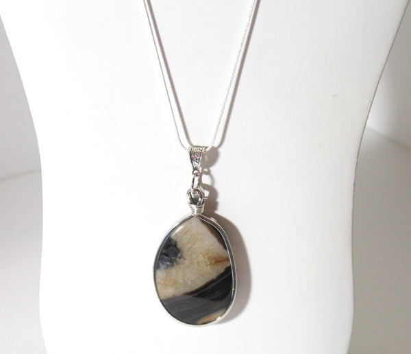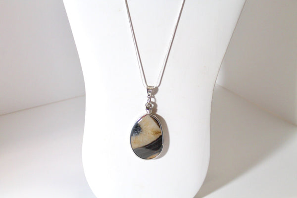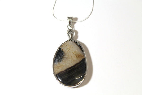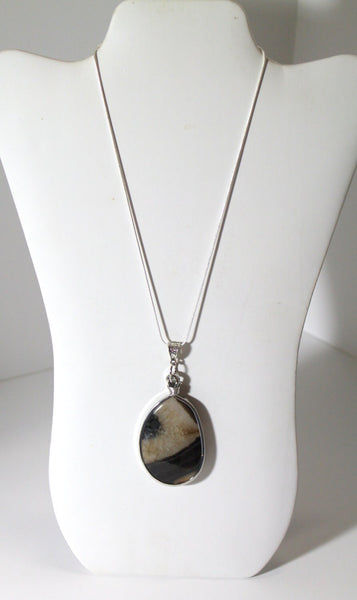 This is a great necklace with lots of class. It is a brown and cream agate slab pendant encased in a silver tone metal. This would be a great gift for yourself or a gift for someone you love! This pendant is available on your choice of 16, 18, 20, 22, 24, 26, 28 or 30 inch sterling silver plated snake chain.
