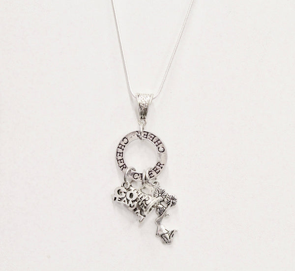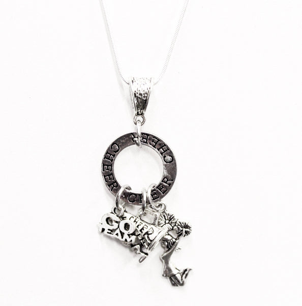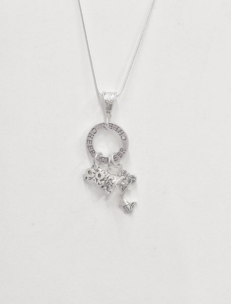 This is a great cheer themed necklace! It is a silver tone pendant on a sterling silver plated snake chain. This would be a great gift for yourself or a gift for someone that is proud of their cheerleader! This is a great way to show that you are a proud cheer mom! This pendant is available on your choice of 16, 18, 20, 22, 24, 26, 28 or 30 inch sterling silver plated snake chain.