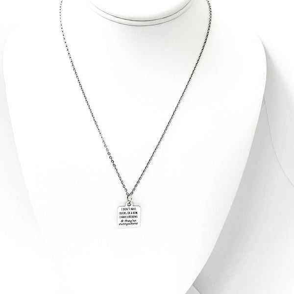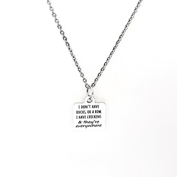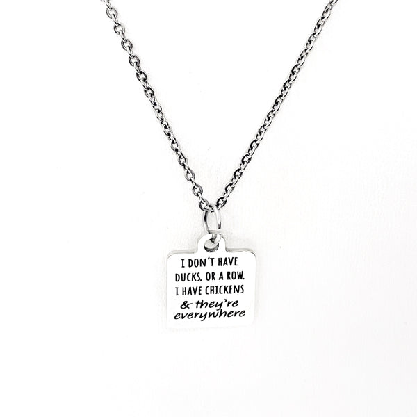 This is a stainless steel laser engraved pendant on a stainless steel chain. The pendant has “I don’t have ducks or a row. I have chickens and they are everywhere” on it. This pendant is available on your choice of 16, 18, 20, 22, 24, 26, 28 or 30 inch chain. The pendant is also available for individual purchase if you have another chain on which you would like to wear it. For an additional charge, the charm can be customized to meet your specific needs.