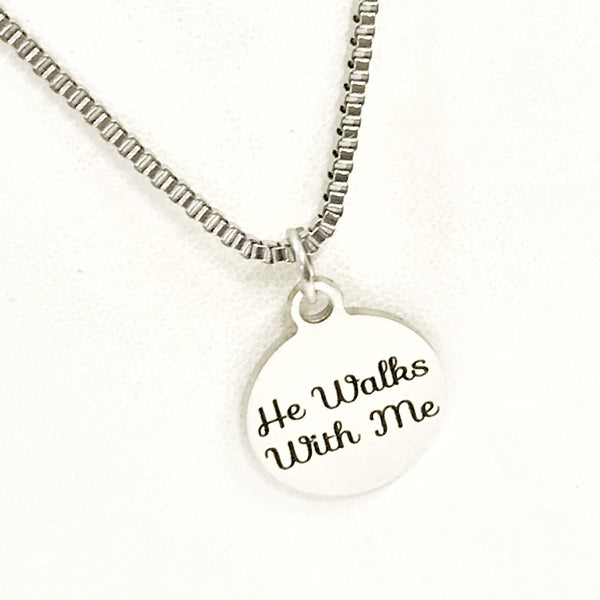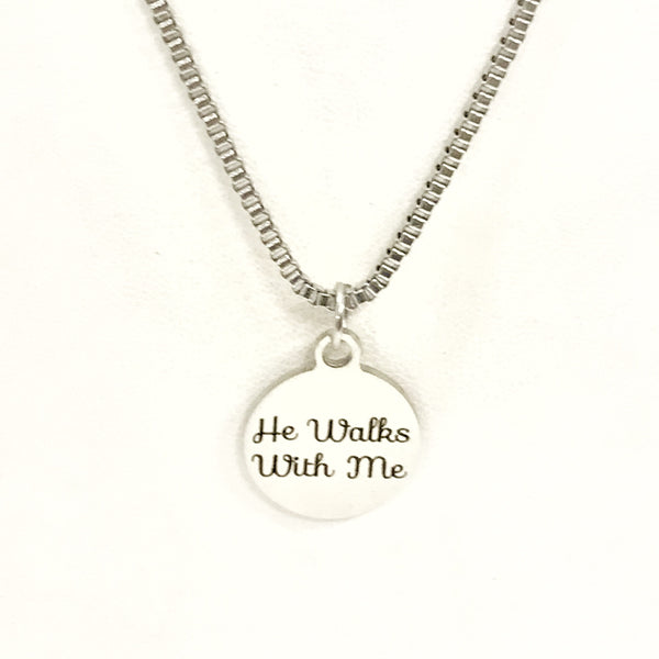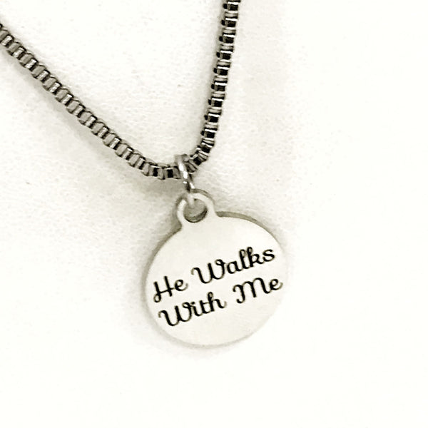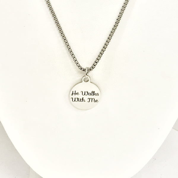 This is Christian gift necklace that would work well for men. This necklace comes with a stainless steel laser engraved charm pendant on a 22 inch stainless steel box chain. The pendant is also available for individual purchase if you have another chain on which you would like to wear it. The pendant has "He Walks With Me" on it.