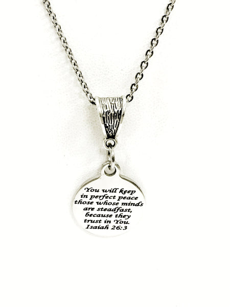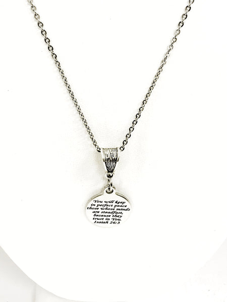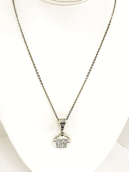 This beautiful necklace would make a great gift to remind the wearer that God’s peace is perfect. The pendant is a stainless steel laser engraved charm with “You will keep in perfect peace those whose minds are steadfast, because they trust in You. Isaiah 26:3” on it with a silver-tone bail.