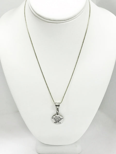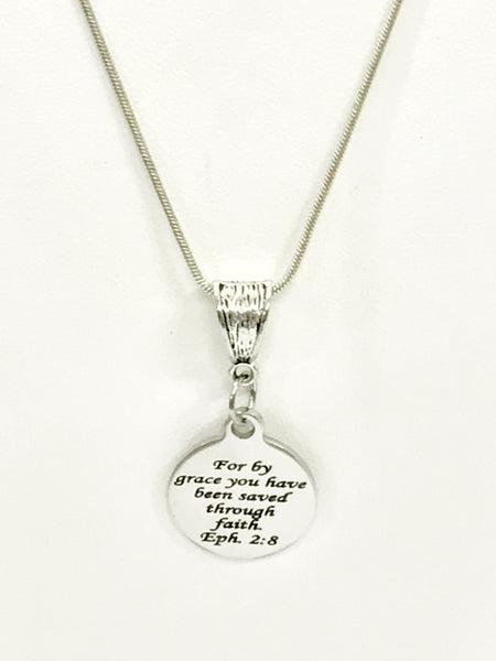 This is a beautiful Christian jewelrygift. It has a stainless steel laser engraved charm with "For by grace you have been saved through faith" from Ephesians 2:8 on it.