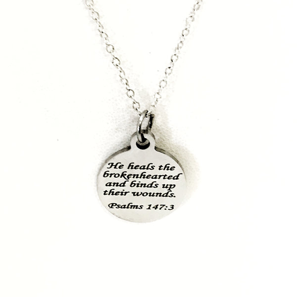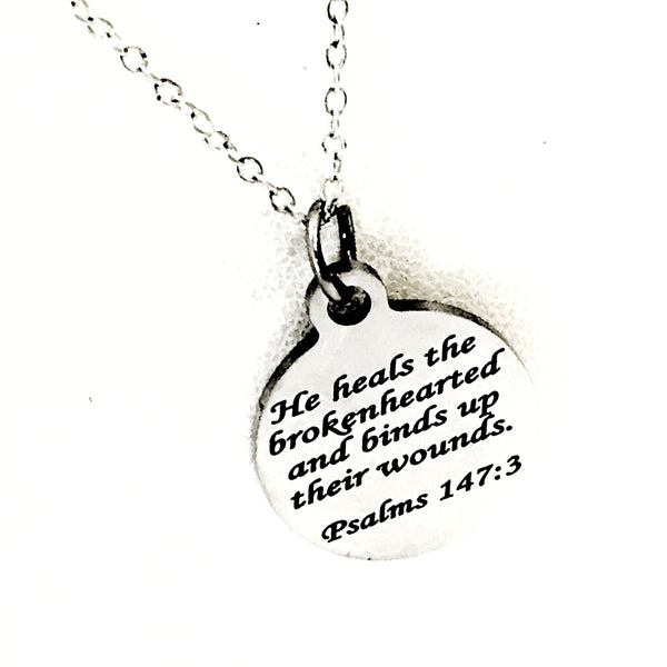 This Christian necklace would make a wonderful reminder that God is our strength even when we don’t feel strong. The pendant is a stainless steel laser engraved pendant with “He heals the brokenhearted and binds up their wounds.” from Psalms 147:3 on it.