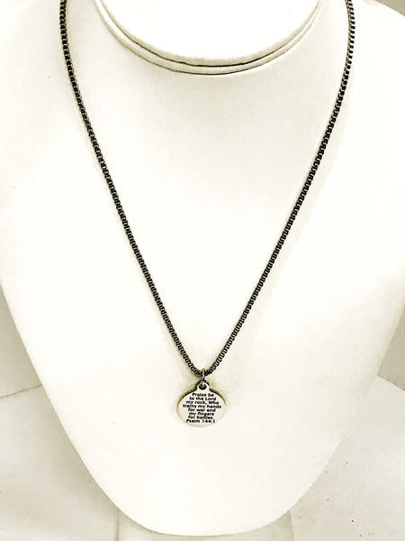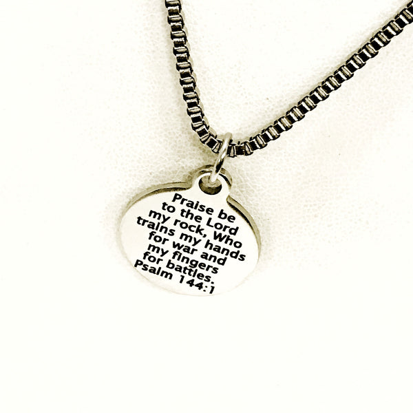 This is great stainless steel necklace for a Christian or military man in your life. This necklace comes with a stainless steel laser engraved charm pendant on a 22 inch stainless steel box chain. The pendant has the following scripture quote from Psalm 144:1 on it: Praise be to the Lord my rock, Who trains my hands for war and my fingers for battles.