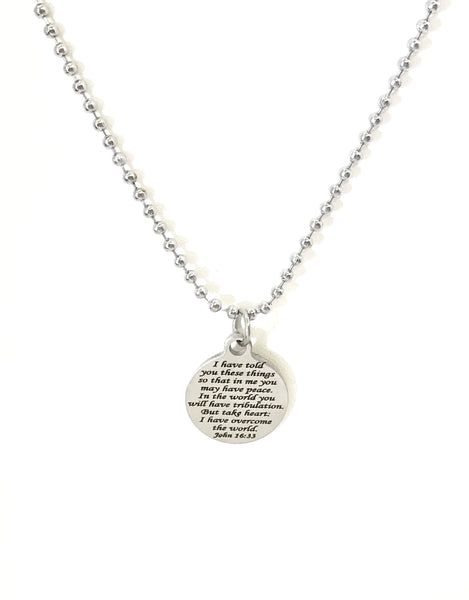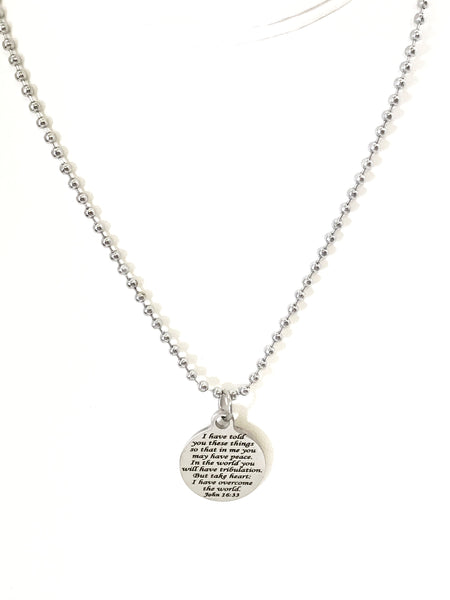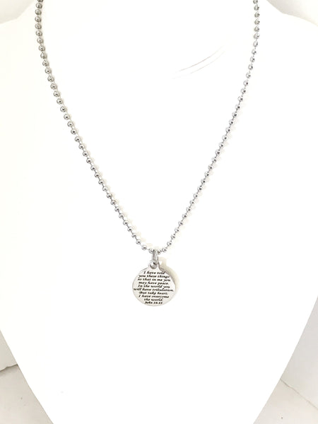 This Christian necklace would make a great graduation or son necklace gift. The pendant is stainless steel laser engraved pendant on a 24 inch stainless steel ball chain. The pendant has the following John 16:33 verse on it: