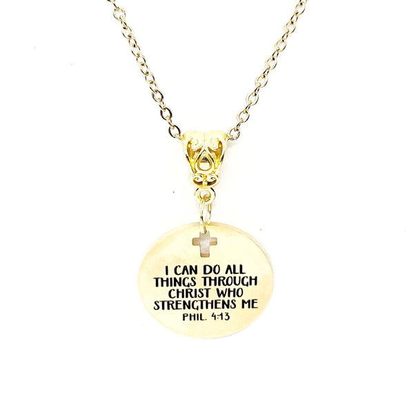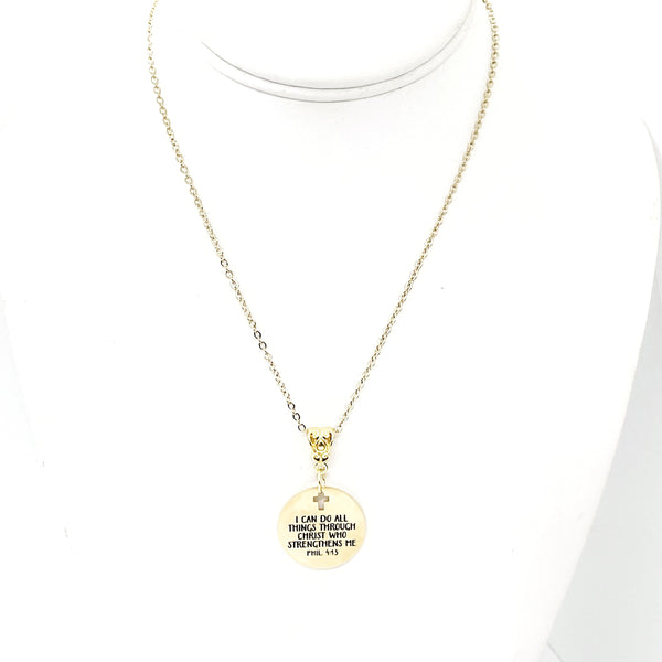 This is a Gold-plated brass necklace with a Gold-plated stainless steel laser engraved pendant with "She may be quiet but she’s a warrior and her prayers can move mountains" on it. This pendant is available on your choice of 16, 18, 20, 22, 24, 26, 28 or 30 inch chain.