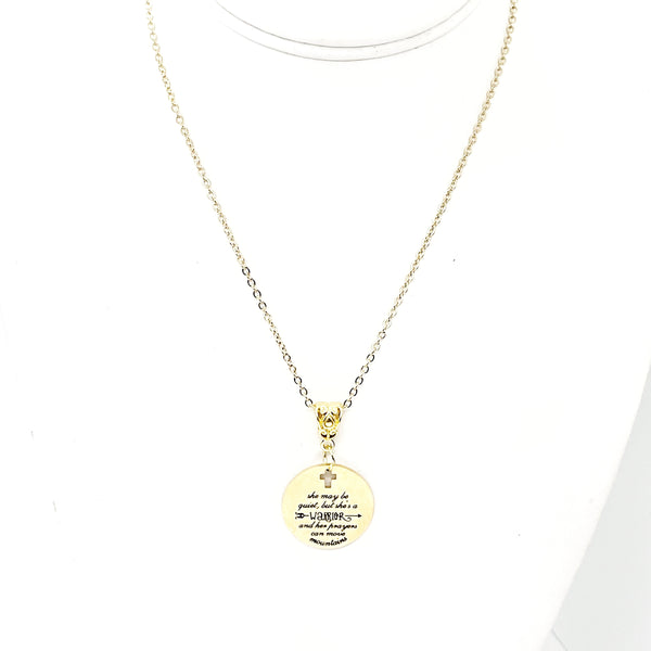 This is a Gold-plated brass necklace with a Gold-plated stainless steel laser engraved pendant with "She may be quiet but she’s a warrior and her prayers can move mountains" on it. This pendant is available on your choice of 16, 18, 20, 22, 24, 26, 28 or 30 inch chain.