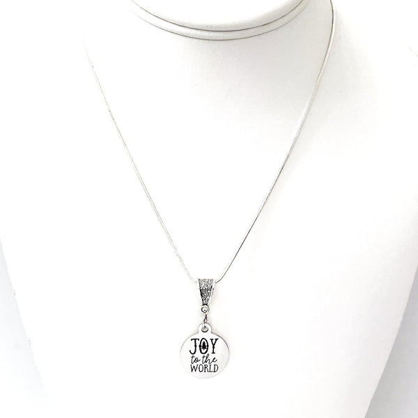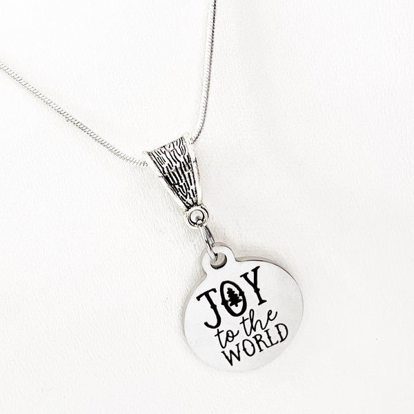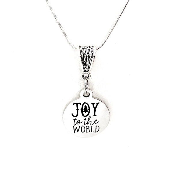 This is a stainless steel laser engraved pendant on a silver-plated chain. The pendant says “Joy to the World”.