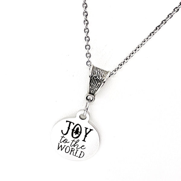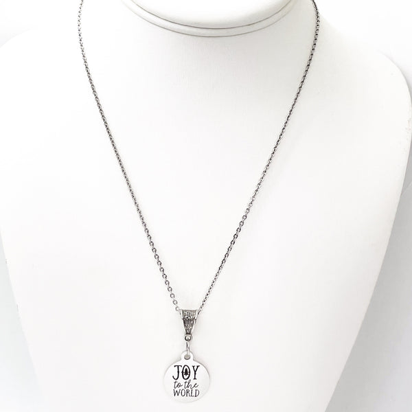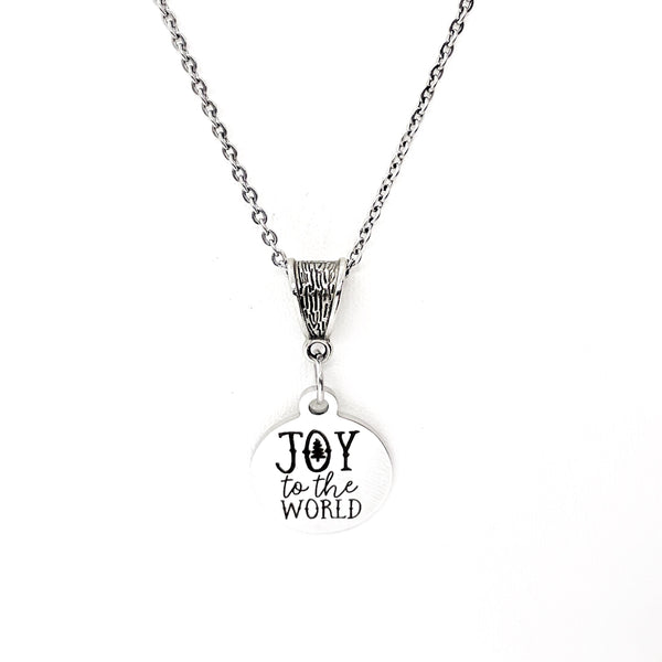 This is a stainless steel laser engraved pendant on a stainless steel link chain. The pendant says “Joy to the World”.