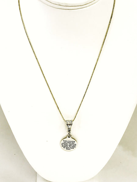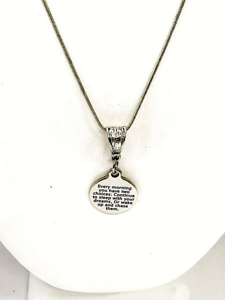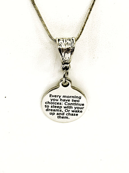 This is a beautiful motivating necklace jewelry gift. It has a stainless steel laser engraved charm with “Every morning you have two choices: Continue to sleep with your dreams, Or wake up and chase them” on it.