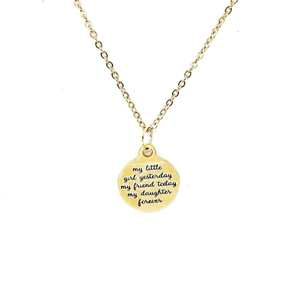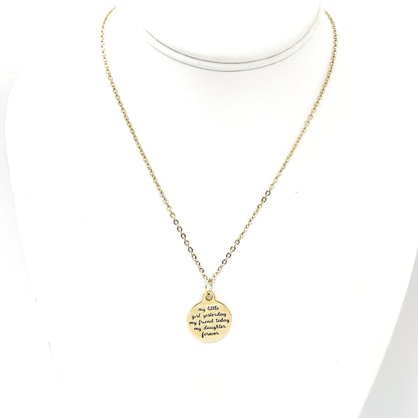 This is a Gold-plated brass necklace with a Gold-plated stainless steel laser engraved pendant with "My little girl yesterday, my friend today, my daughter forever" on it. This pendant is available on your choice of 16, 18, 20, 22, 24, 26, 28 or 30 inch chain.
