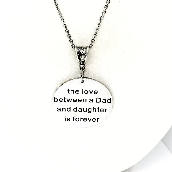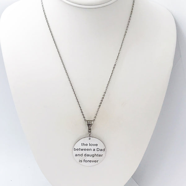 The is a beautiful jewelry piece that has a stainless steel laser engraved charm with “The love between a father and daughter is forever” on it. The charm measures approx. 1 1/4 inch across.