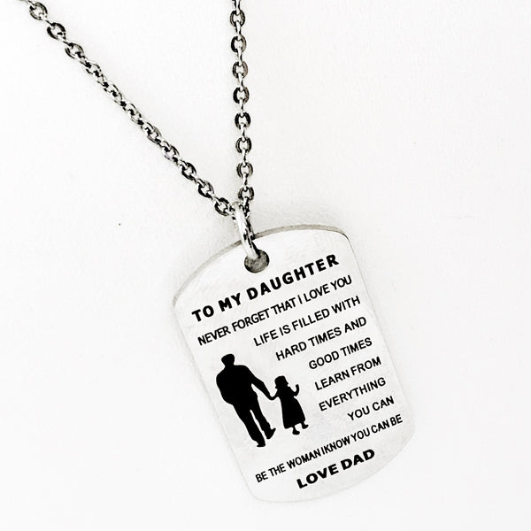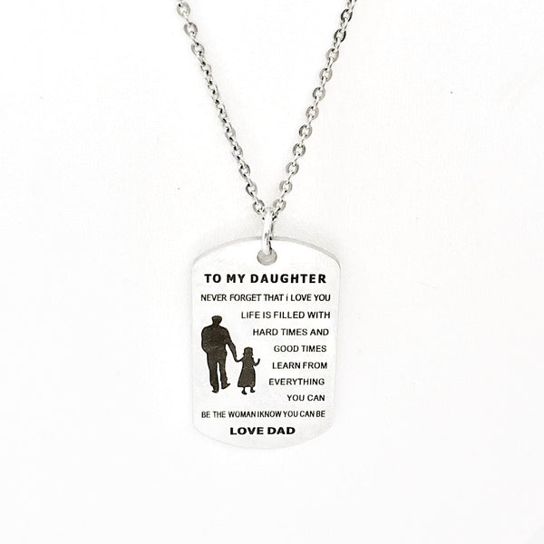 This stainless steel necklace has a laser engraved dogtag with the following on it: