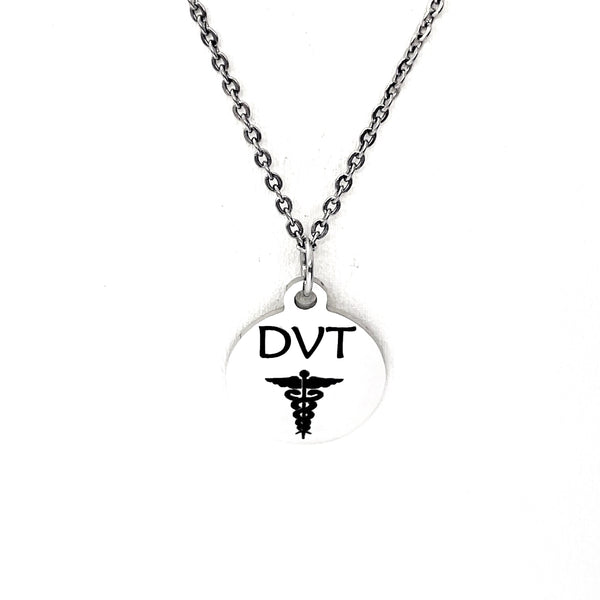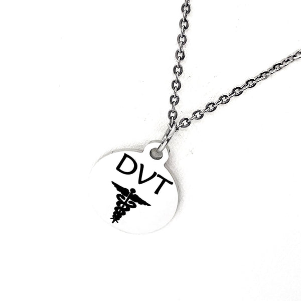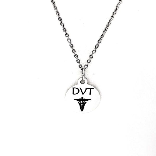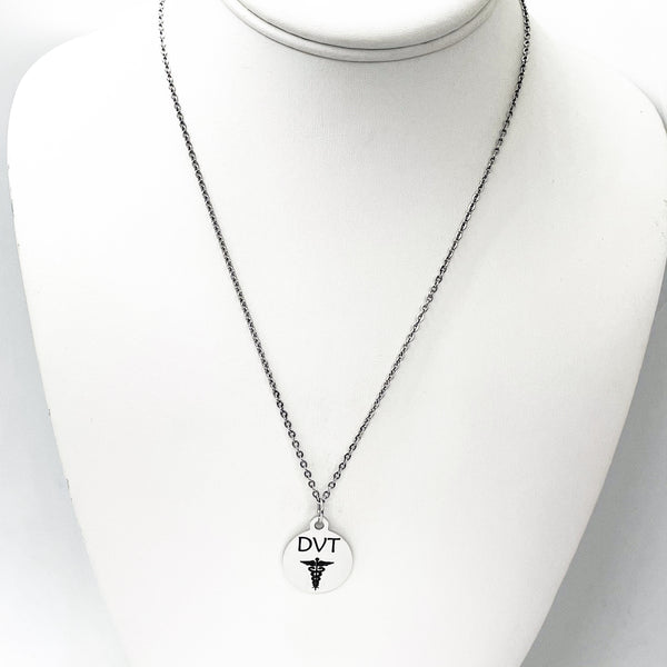 This is a stainless steel laser engraved pendant on a stainless steel chain. The pendant has “DVT” and a medical caduceus symbol on it. This pendant is available on your choice of 16, 18, 20, 22, 24, 26, 28 or 30 inch chain. The pendant is also available for individual purchase if you have another chain on which you would like to wear it. For an additional charge, the charm can be customized to meet your specific needs.
