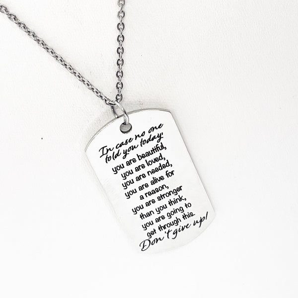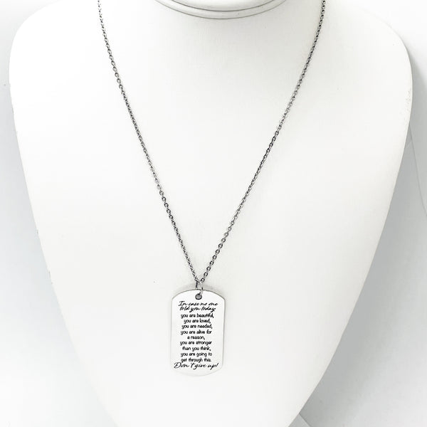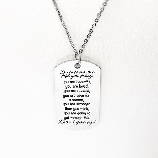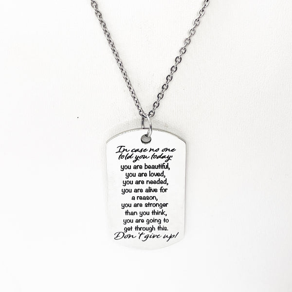 This is a stainless steel laser engraved pendant on a stainless steel chain. The pendant has “In case no one told you today, you are beautiful, you are loved, you are needed, you are alive for a reason, you are stronger than you think, you are going to get through this. Don’t give up!” on it. This pendant is available on your choice of 16, 18, 20, 22, 24, 26, 28 or 30 inch chain. The pendant is also available for individual purchase if you have another chain on which you would like to wear it. For an additional charge, the charm can be customized to meet your specific needs.
