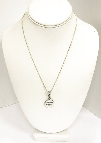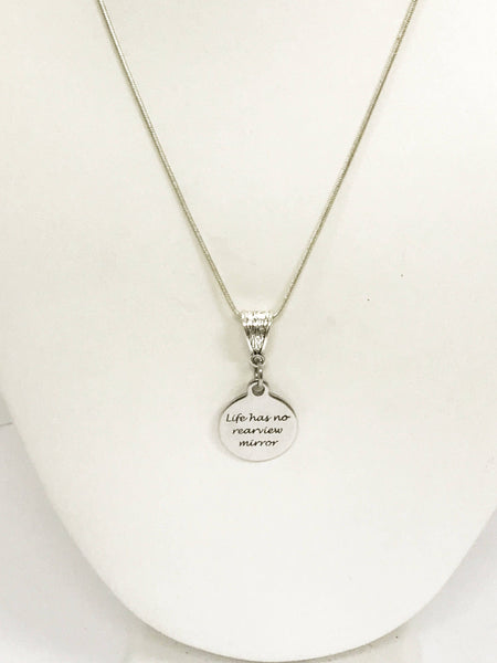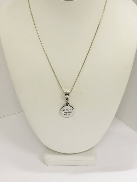 This beautiful necklace is a reminder to move forward in life and not look back. The pendant has "Life has no rearview mirror" on it.