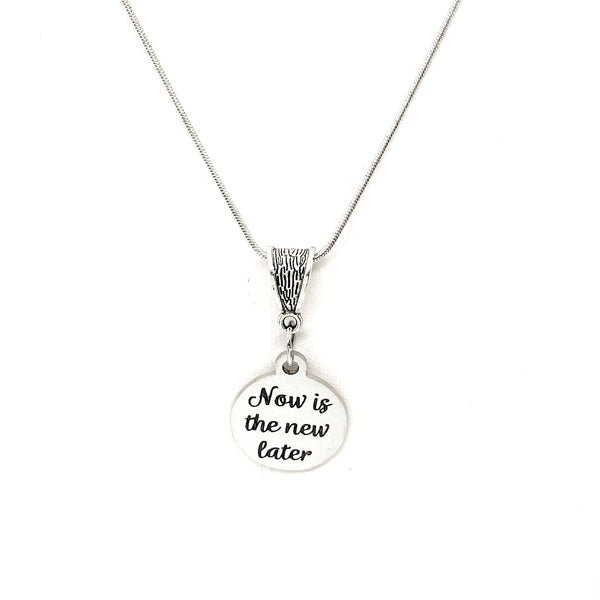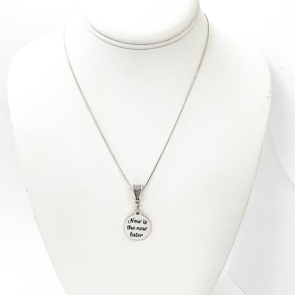This is a stainlses steel laser engraved pendant on a silver-plated chain. The pendant has “Now is the new later” on it. This pendant is available on your choice of 16, 18, 20, 22, 24, 26, 28 or 30 inch sterling silver chain. The pendant is also available for individual purchase if you have another chain on which you would like to wear it.