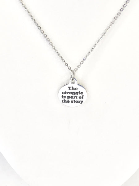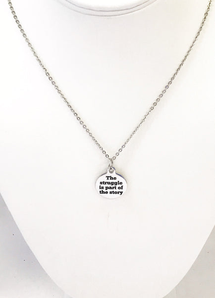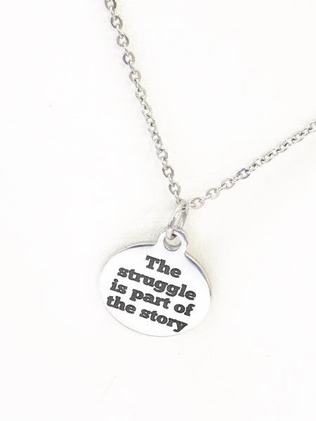 This encouraging gift necklace makes a great graduation gift. It is a stainless steel laser engraved pendant with "The struggle is part of the story” on it. The pendant comes on a stainless steel chain. This pendant is available on your choice of 16, 18, 20, 22, 24, 26, 28 or 30 inch chain. The pendant is also available for individual purchase if you have another chain on which you would like to wear it.