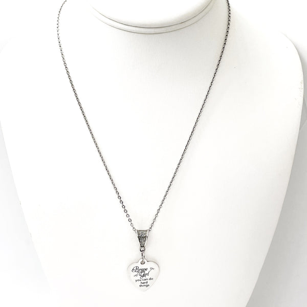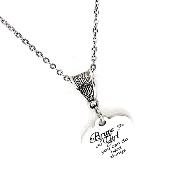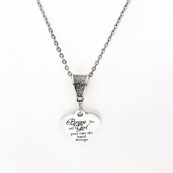 This is a stainless steel laser engraved pendant on a stainless steel link chain. The pendant says “Brave Girl you can do hard things”.