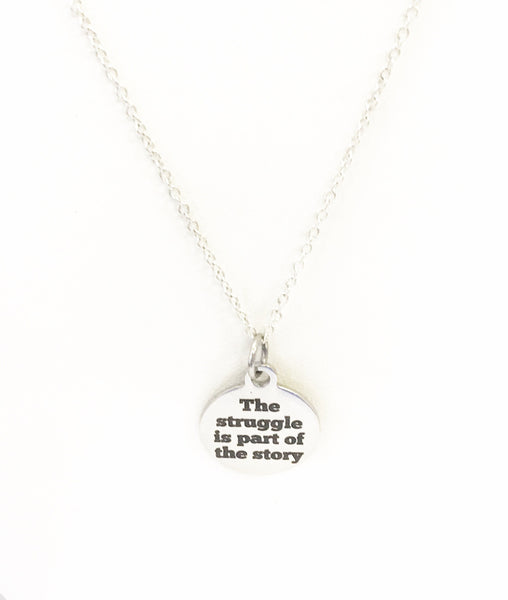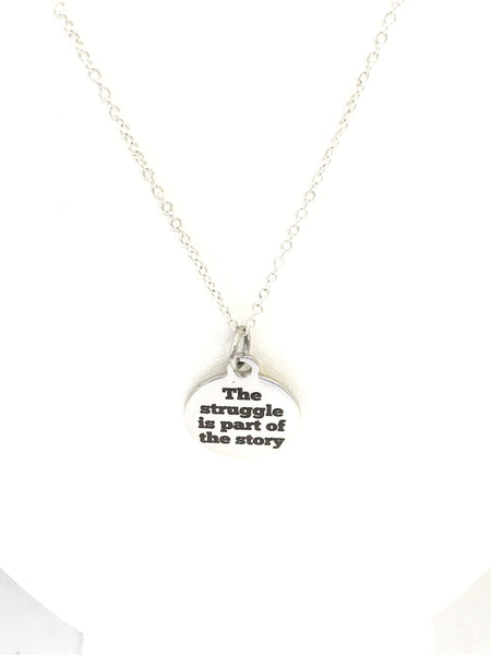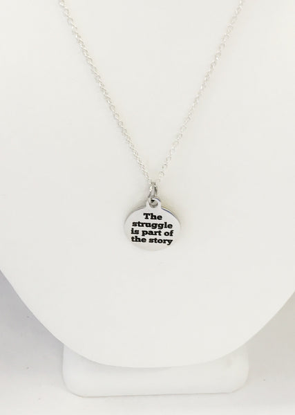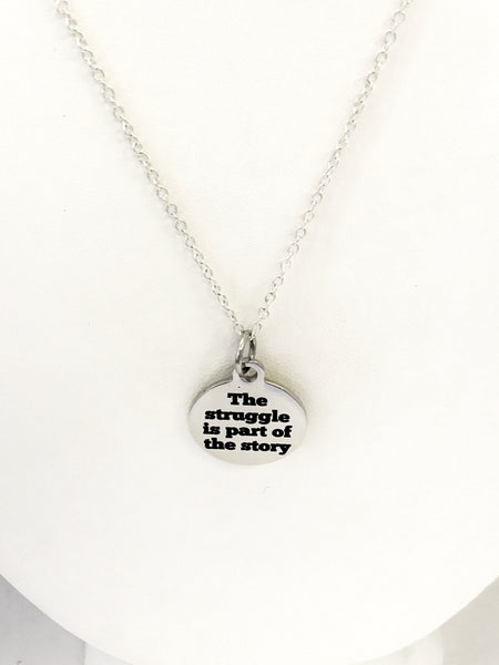 This encouraging quote necklace is a beautiful stainless steel laser engraved pendant with "The struggle is part of the story" on it. This pendant is available on your choice of 16, 18, 20, 22, 24, 26, 28 or 30 silver-plated inch chain. The pendant is also available for individual purchase if you have another chain on which you would like to wear it.