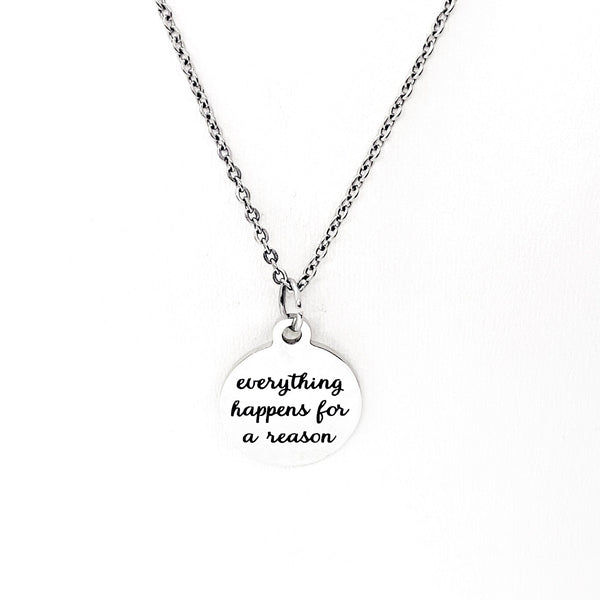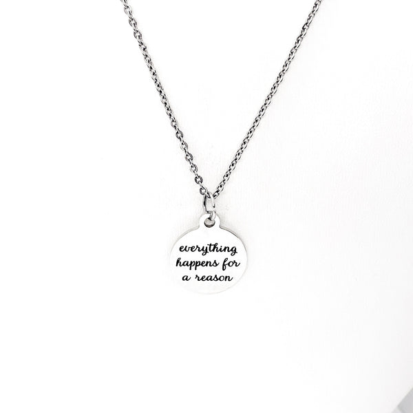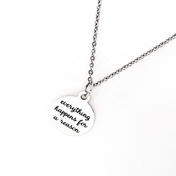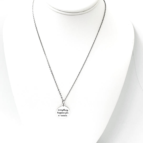 This is a stainless steel laser engraved pendant on a stainless steel chain. The pendant has “Everything happens for a reason” on it. This pendant is available on your choice of 16, 18, 20, 22, 24, 26, 28 or 30 inch chain. The pendant is also available for individual purchase if you have another chain on which you would like to wear it. For an additional charge, the charm can be customized to meet your specific needs.