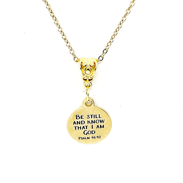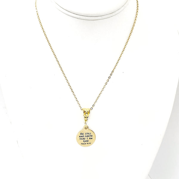 This is a Gold-plated brass necklace with a Gold-plated stainless steel laser engraved pendant with "Be still and know that I am God" from Psalm 46:10 on it. This pendant is available on your choice of 16, 18, 20, 22, 24, 26, 28 or 30 inch chain.