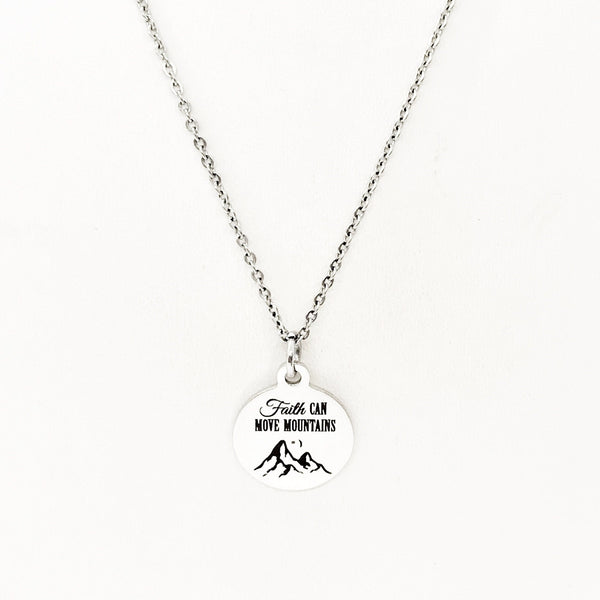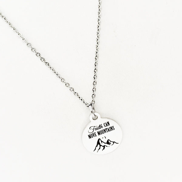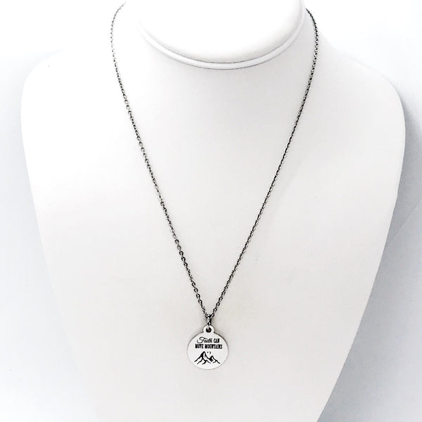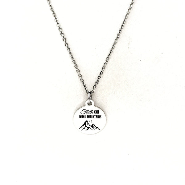 This beautiful necklace would make a wonderful gift. The pendant is a stainless steel laser engraved pendant that has “Faith can move mountains” on it.