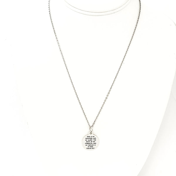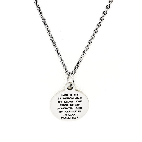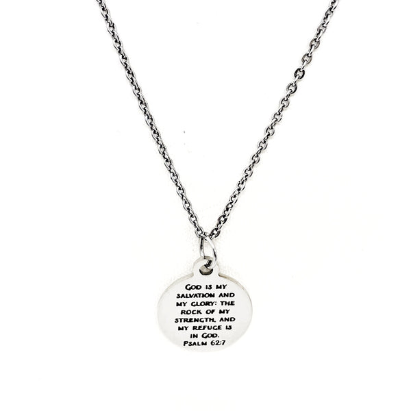 The is a beautiful jewelry piece that has a stainless steel laser engraved charm with “God is my salvation and my glory: the rock of my strength, and my refuge is in God” from Psalm 62:7 on it. The charm measures approx. 3/4 inch across.