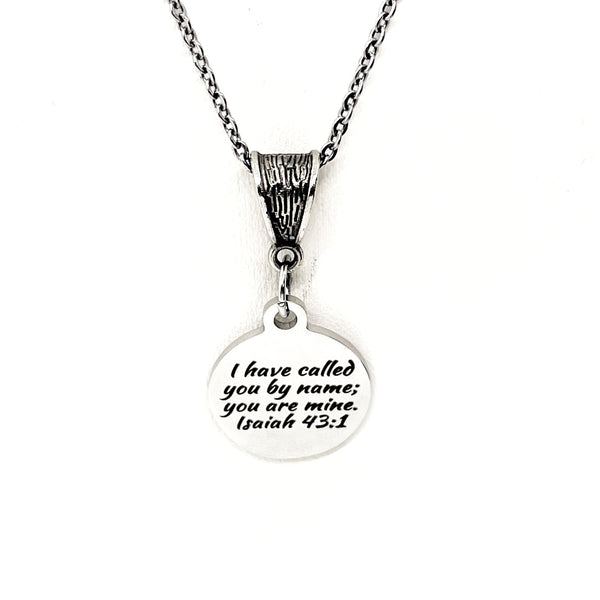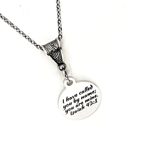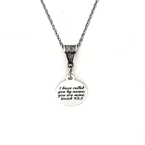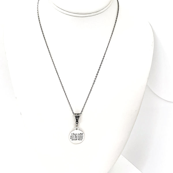 This beautiful necklace would make wonderful gift. It has a laser engraved charm with “I have called you by name; you are mine” from Isaiah 43:1 on it. The charm measures approx. 3/4 inch across.
