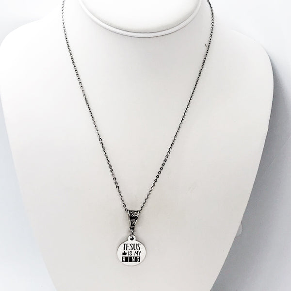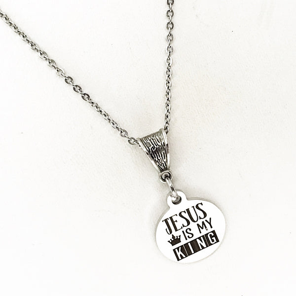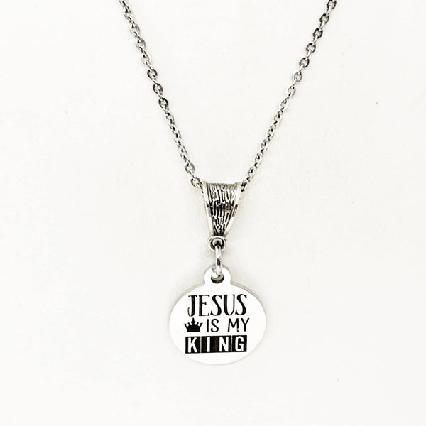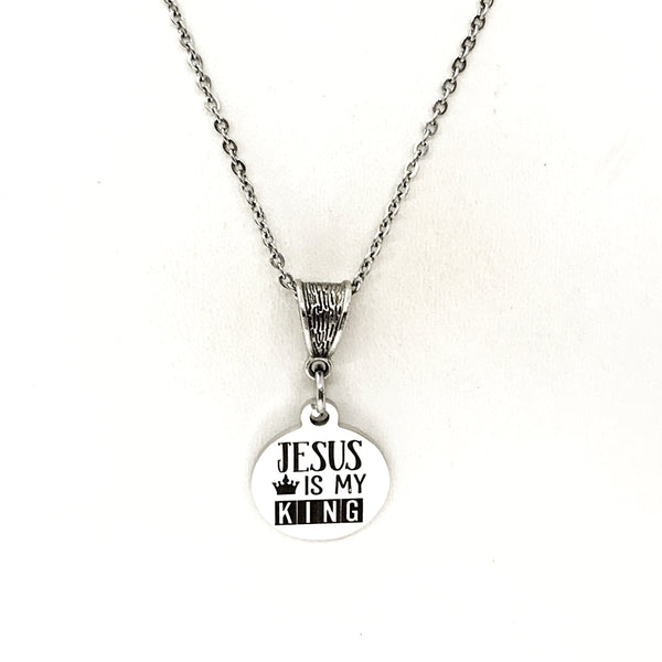 The is a beautiful jewelry piece that has a stainless steel laser engraved charm with “Jesus Is My King” on it. The charm measures approx. 3/4 inch across.